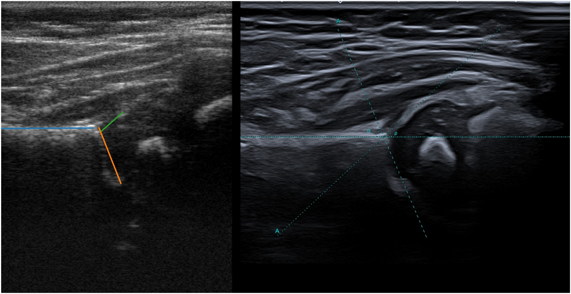 Figure: Left hip of a female infant at the age of 15 weeks, term 40 + 0 weeks, and reason for referral was a family history positive for DDH. Left image: selected frame of acquisition of novice user with α-angle 69°, β-angle 41° and diagnosis ‘no DDH’. Right image: ground truth ultrasound by a radiologist with α-angle 67°, β-angle 43° and diagnosis ‘no DDH’.